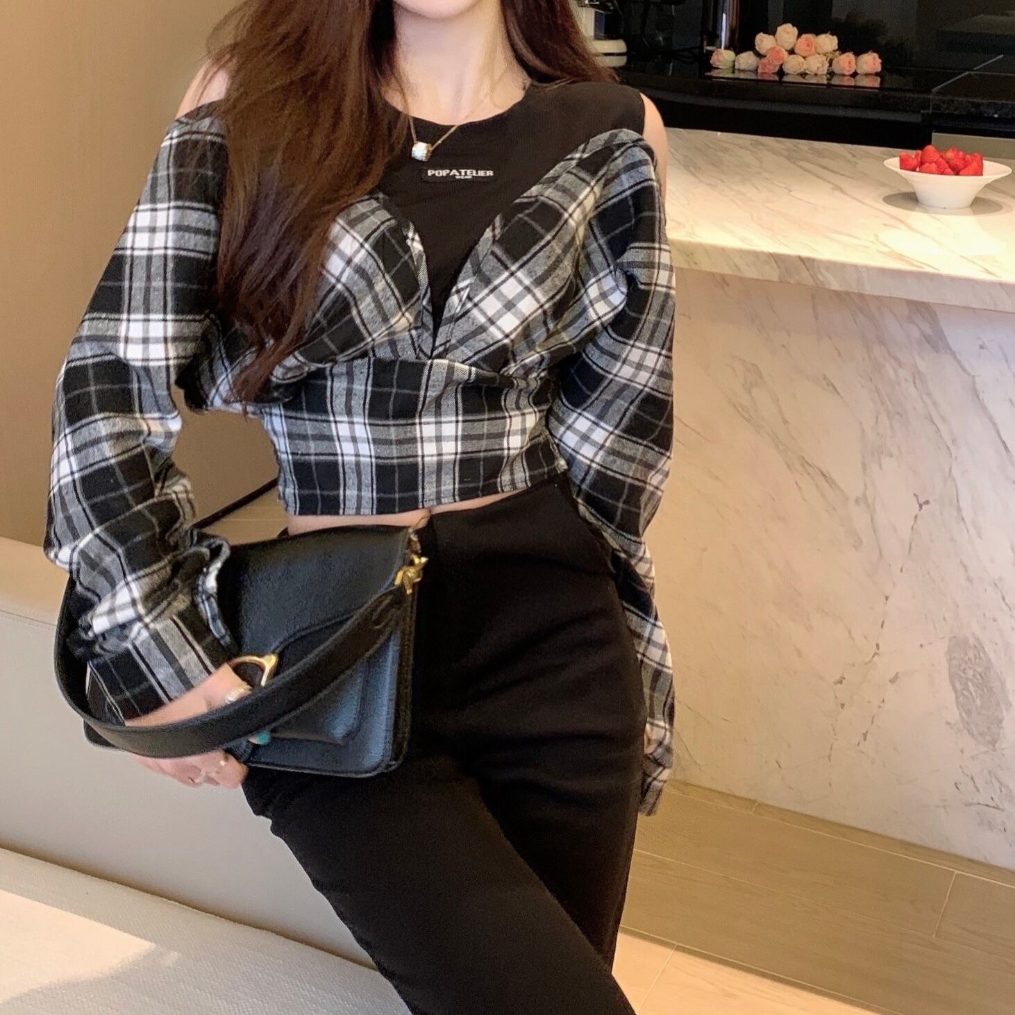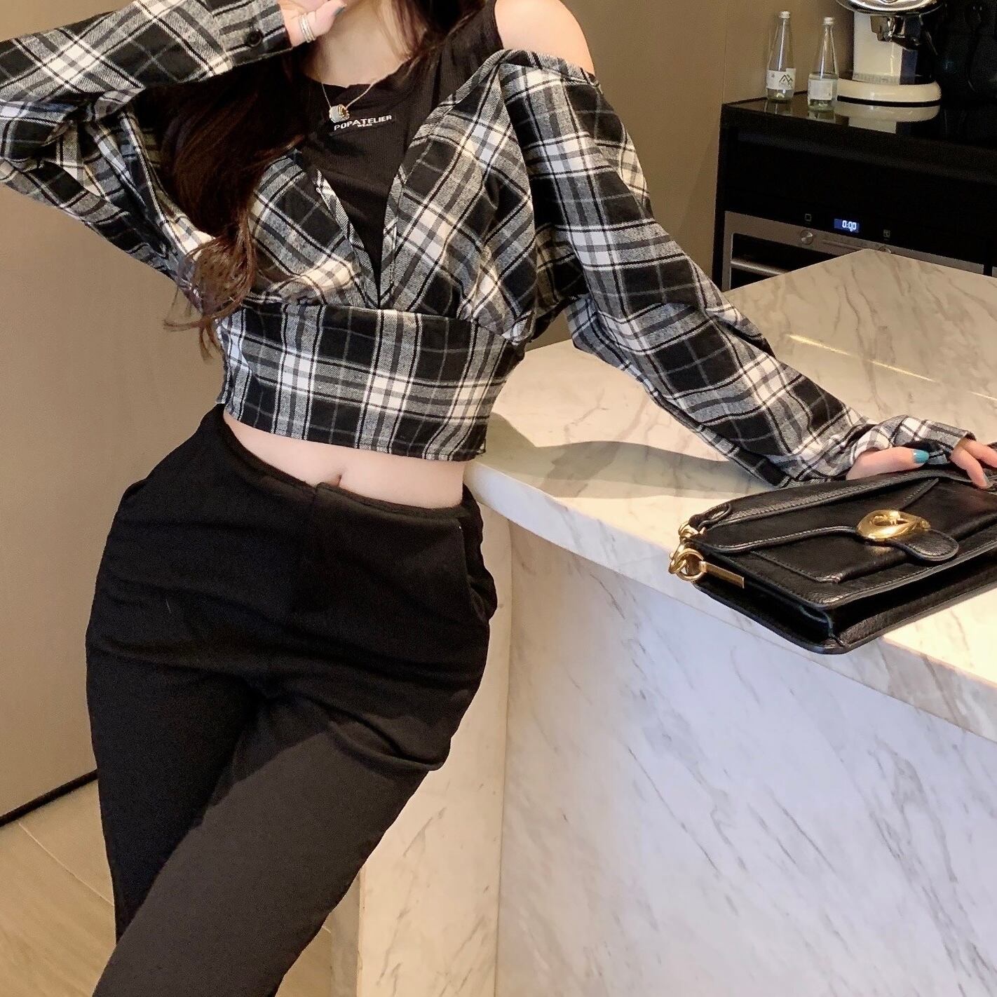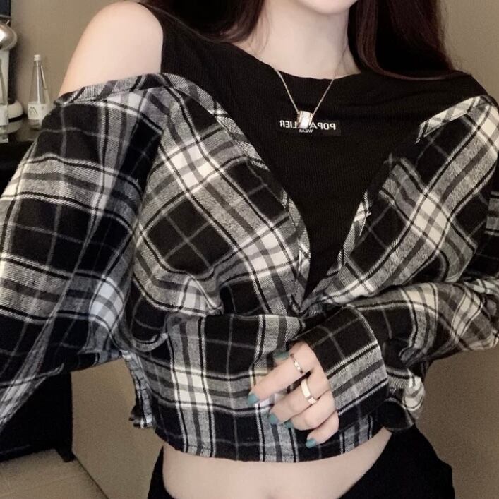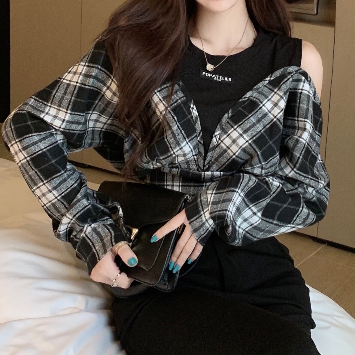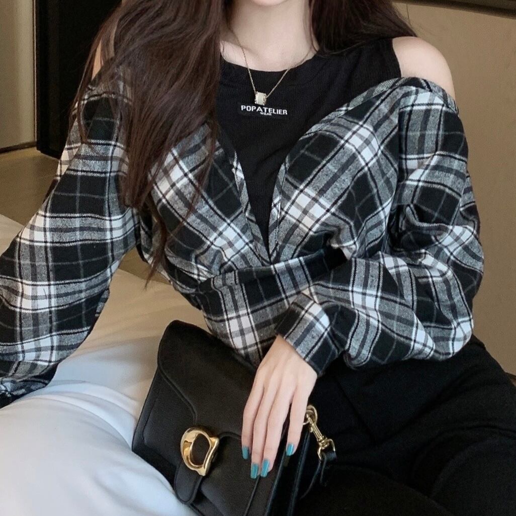 オープンショルダーチェックトップス