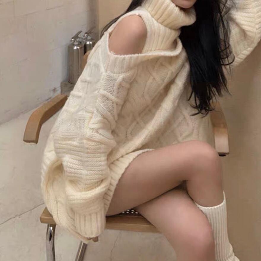 オープンショルダータートルネックニットミニワンピース