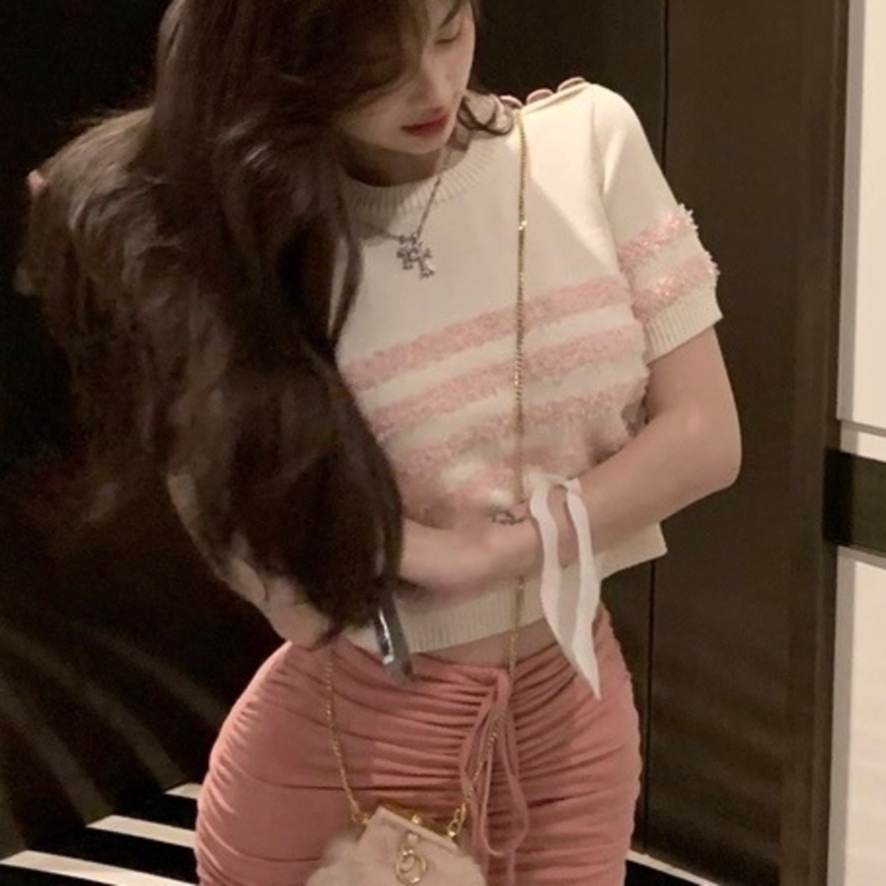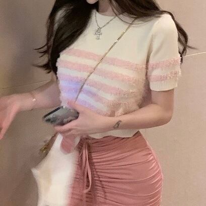 ビンクボーダー半袖ニットトップス