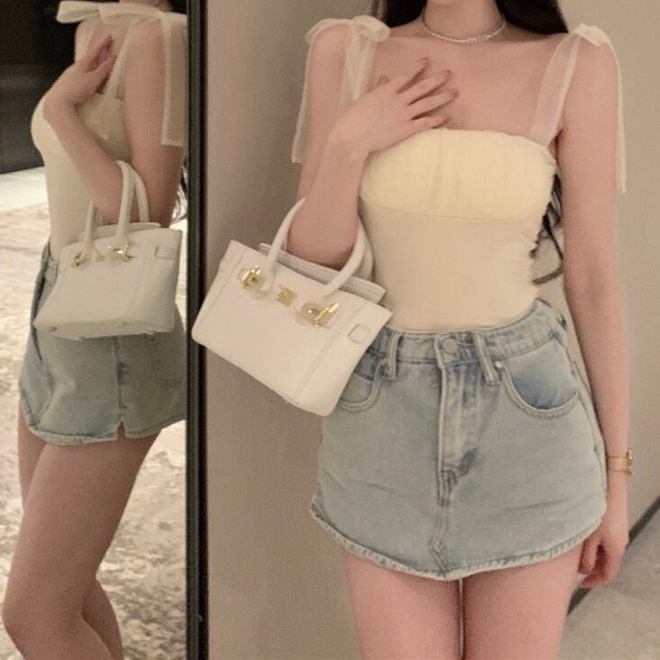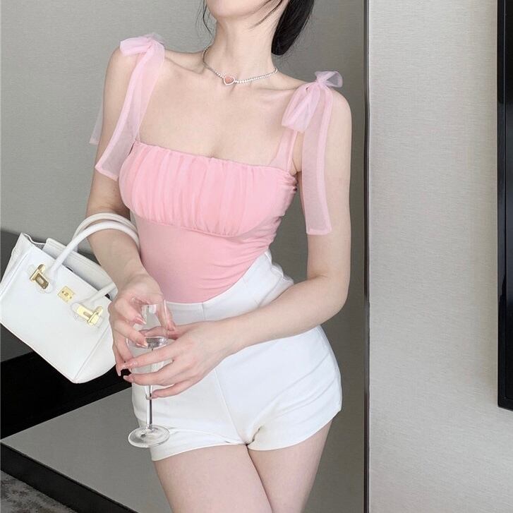 全2色肩リボンシフォンキャミトップス