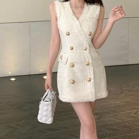 VネックノースリーブWジャケット風ミニワンピース