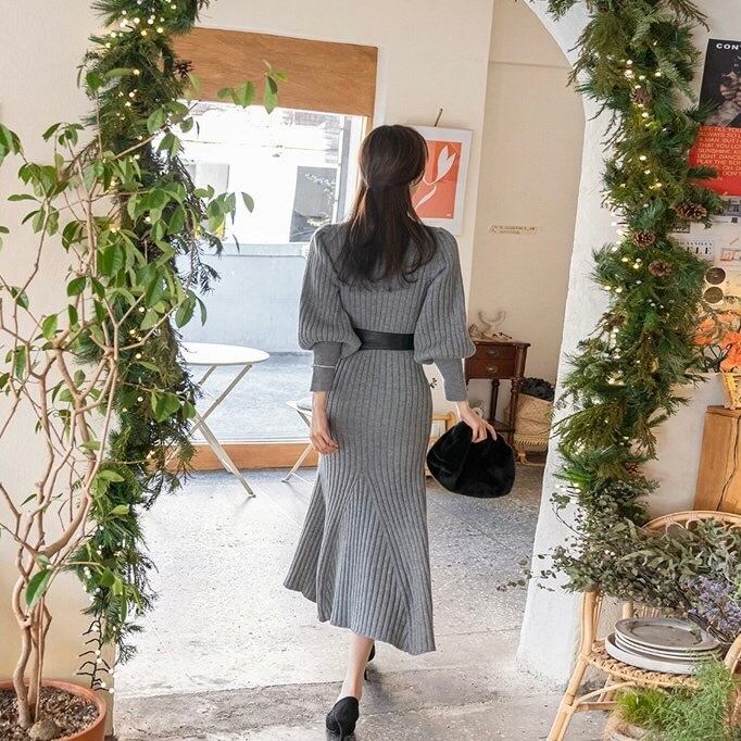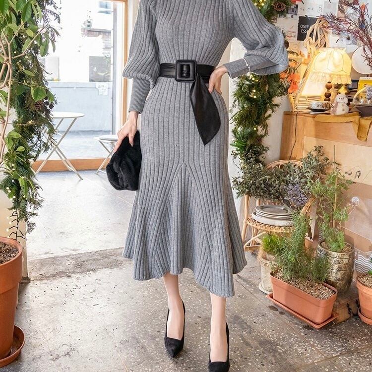 Tall ✰︎全2色タートルネックランタンスリーブニットワンピースベルト付き