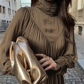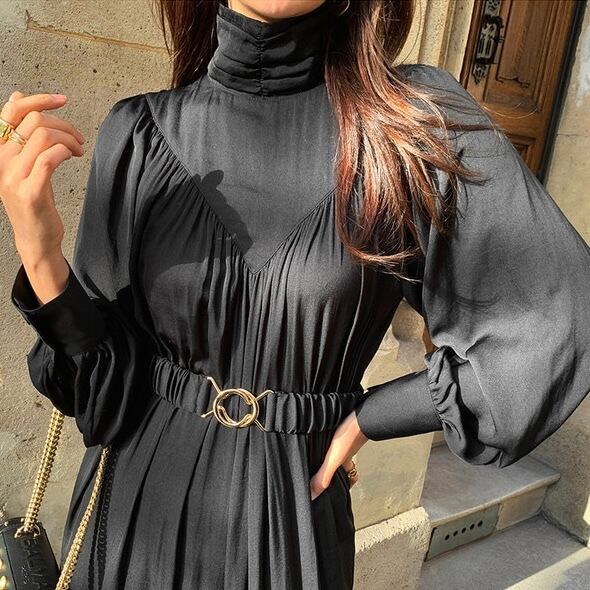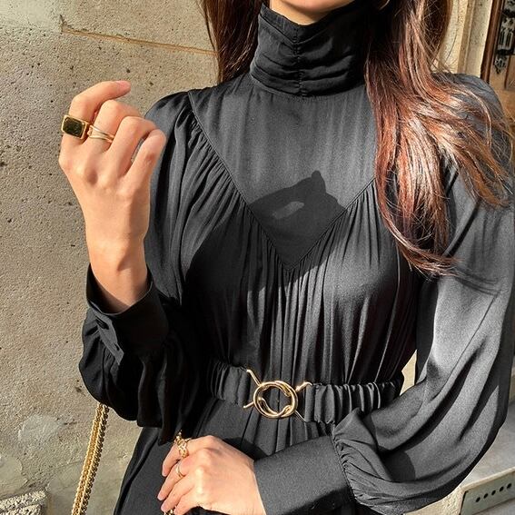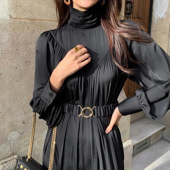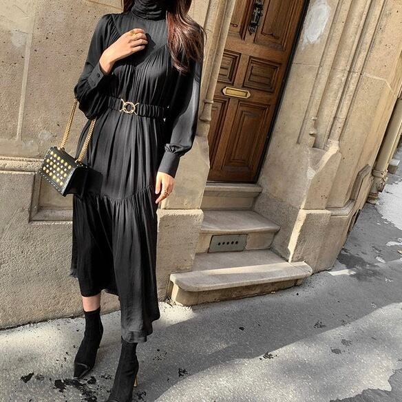 Tall✰︎全2色ハイネックバブルスリーブプリーツロングワンピース