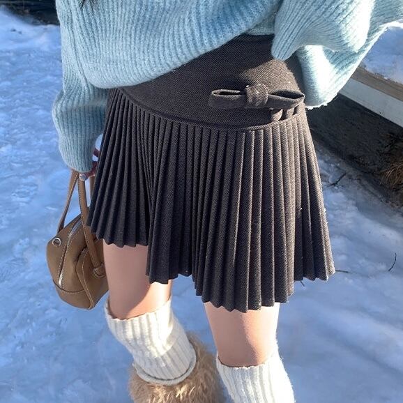 全3色サイドリボン細プリーツミニスカート