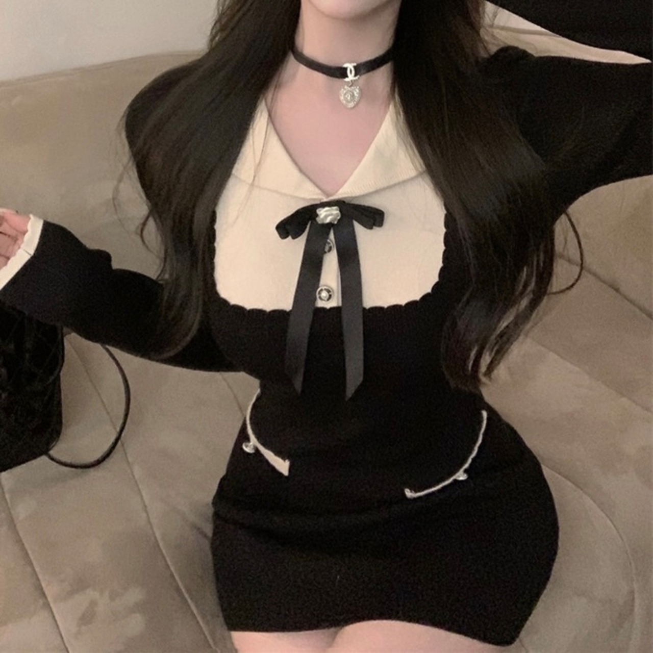 襟付きバイカラーニットミニワンピース