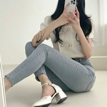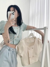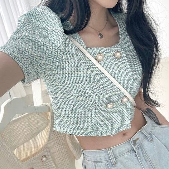 全2色パフスリーブスリーブWパールボタンショートトップス