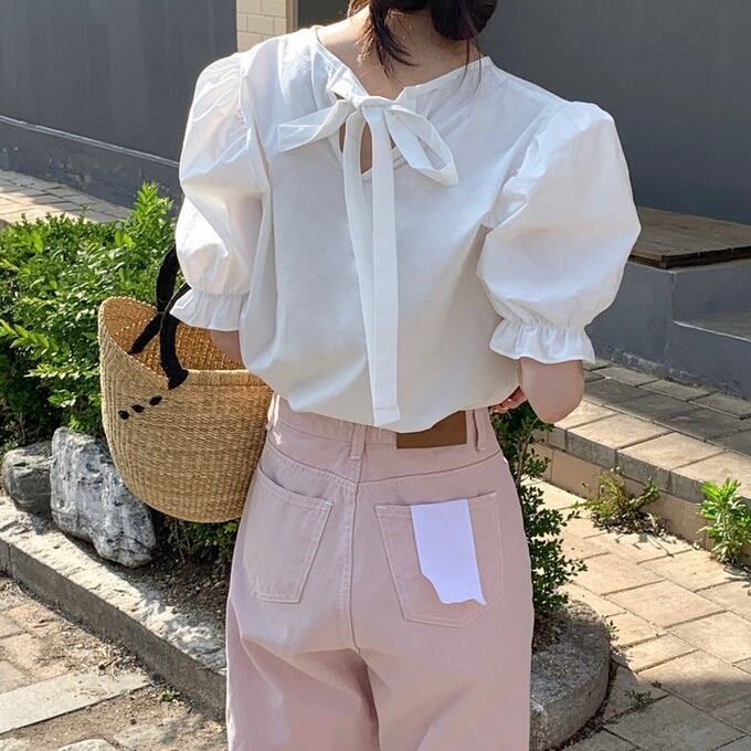 全2色バックリボンパフスリーブブラウス